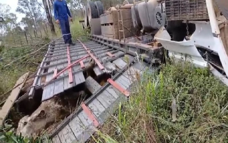 Uma carreta que transportava bois tombou, resultando na morte do motorista, que ficou preso às ferragens, e no espalhamento de animais pela região.