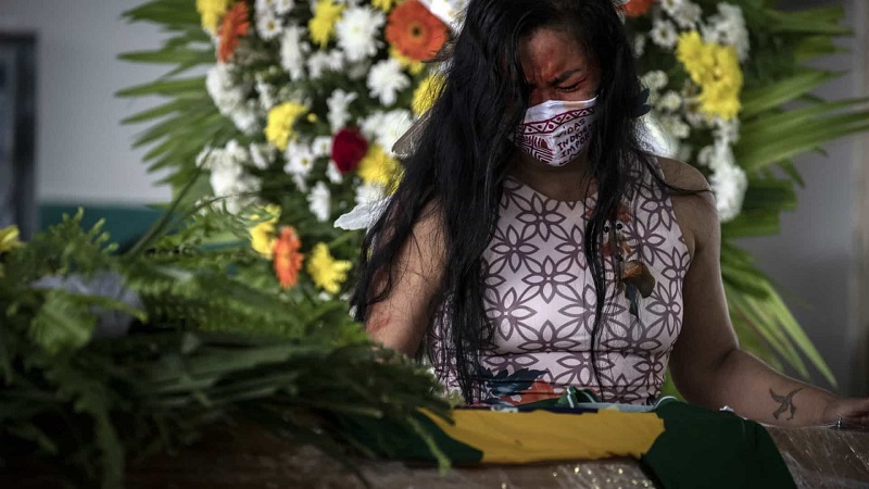 Os índios não puderam prestar homenagem através dos seus rituais tradicionais, tendo a cerimônia fúnebre sido feita com o caixão fechado e coberto por plástico, para evitar qualquer contaminação, observou um fotógrafo da AFP.