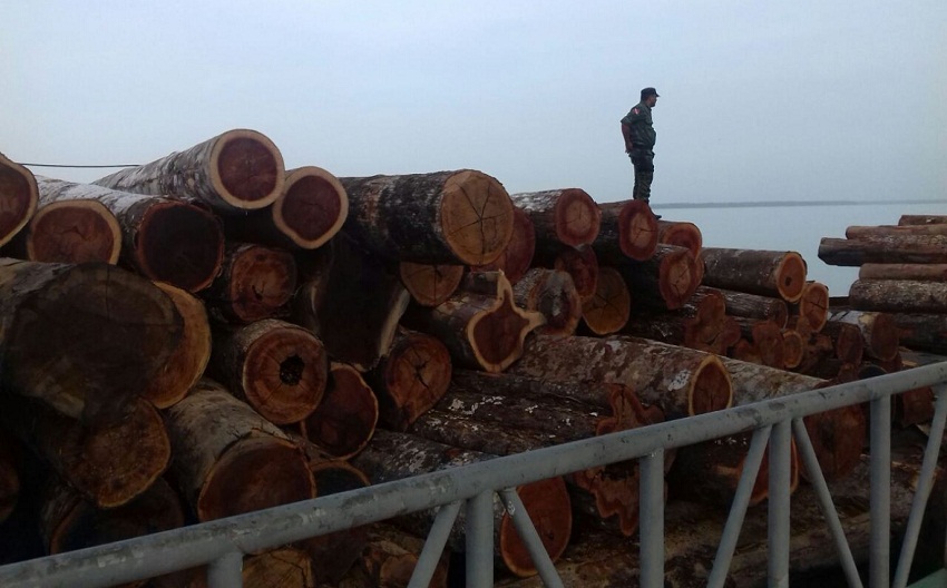 Foto: Polícia Militar/Divulgação – Cerca de 800 metros cúbicos de madeira em tora que estavam sendo transportados em uma balsa próximos à baía do Carnapijó, no município de Barcarena, na Região Metropolitana de Belém, foram apreendidas pela companhia de Policia Fluvial no final da noite deste domingo (23). Segundo informações da PM, seis pessoas que estavam na embarcação foram detidas e encaminhadas para a Delegacia Fluvial, em Belém. A quantidade apreendida corresponde ao espaço ocupado por aproximadamente de  100 carros populares.
