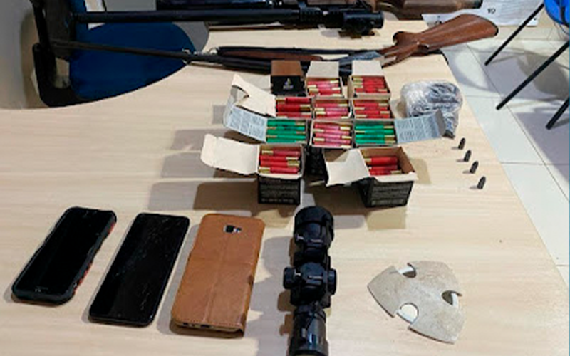 Durante a diligência, a equipe policial realizou averiguações em residências próximas, momento em que um dos suspeitos empreendeu fuga ao perceber a chegada da polícia. Em uma das residências vistoriadas, foram encontrados cinco cartuchos intactos, um cartucho deflagrado, além de duas espingardas calibre 36 e calibre 16.