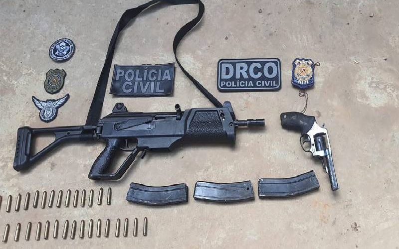 Após a captura do investigado, foram apreendidos um revólver calibre 38 e uma carabina CT 30 com numeração raspada, três carregadores contendo 40 munições intactas, além de diversos estojos de munições deflagradas e um documento com sinais de falsificação.