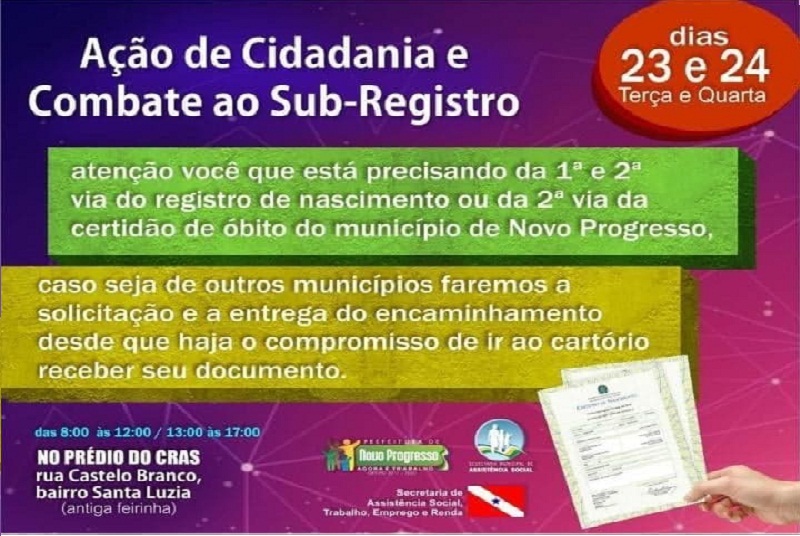 Ação de Cidadania no CRAS em Novo Progresso vai emitir 1ª e 2ª via de Certidão de Nascimento e 2ª via de Certidão de Óbito
