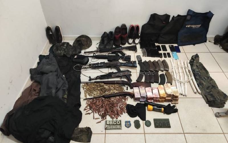 Além do valor em espécie, foram apreendidos também quatro fuzis, duas armas de fabricação caseira, cartucheiras .32 e .40, mais de 400 munições, 21 carregadores de armas; explosivos, dois coletes balísticos, oito celulares, lanternas e roupas camufladas.