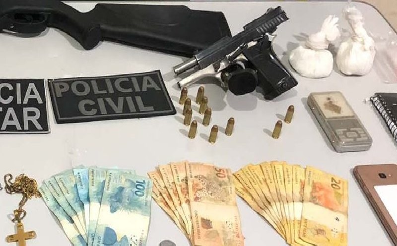 Durante as buscas foram apreendidos cerca de 140 gramas de cocaína, uma pistola calibre .40 mm, uma espingarda calibre 5.5mm, além de dinheiro, celulares, cordões e outros pertences. Três mulheres e um homem foram presos por tráfico de drogas e um adolescente foi apreendido. O caso foi registrado na Delegacia de Polícia Civil do município.