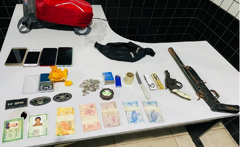 No local, foram encontrados 110 gramas de maconha, oito gramas de cocaína, um revólver calibre 32, uma arma de fabricação caseira calibre 12, uma balança de precisão e quatro aparelhos celulares, além de materiais para embalar drogas.