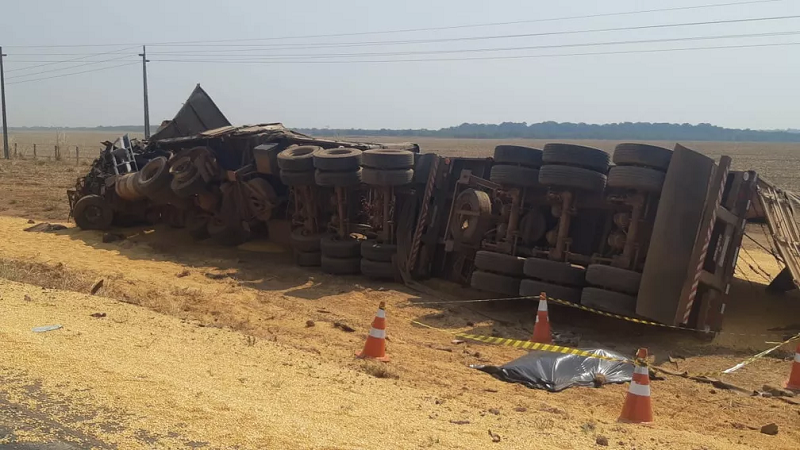 Acidente entre 3 carretas mata motorista e deixa carga esparramada em rodovia em MT