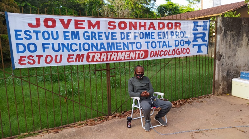 Um homem de 50 anos, identificado Antônio Dias, mais conhecido como jovem sonhador, iniciou uma greve de fome na manhã desta quarta-feira (08), em frente ao Hospital Regional do Tapajós (HRT). Acorrentado pelas pernas e com uma faixa de protesto, Antônio pede que a Unidade seja inaugurada em sua totalidade de atendimentos e serviços.