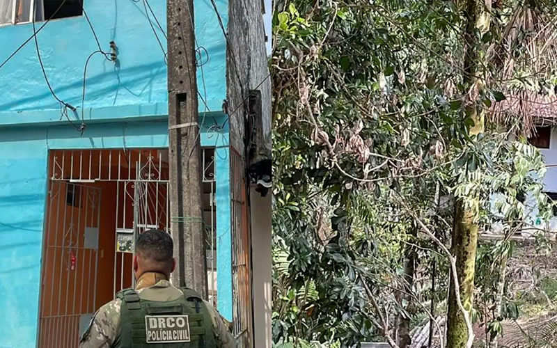 A imagem mostra um policial civil da Divisão de Repressão ao Crime Organizado (DRCO) em frente a uma casa (à esquerda) e um imóvel em meio a uma área de mata (à direita). (Foto: Divulgação | Agência Pará)