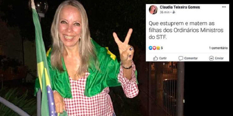 Na última sexta-feira (8), Claudia Teixeira Gomes publicou a seguinte mensagem no Facebook: “Que estuprem e matem as filhas dos Ordinários Ministros do STF”. Após a repercussão negativa, a advogada apagou a postagem e o perfil.