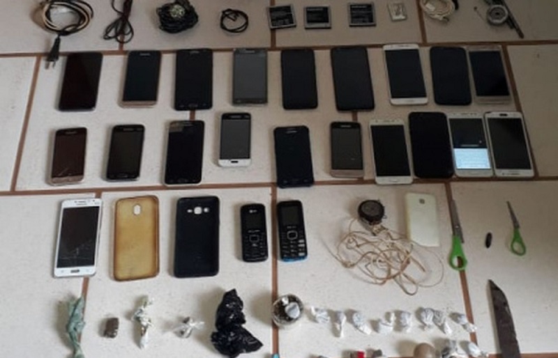 Na ação de revista foram encontrados 28 celulares, 20 carregadores, 20 fones de ouvido, 4 baterias, 6 isqueiros, 1 tesoura sem ponta e 53 papelotes de droga.