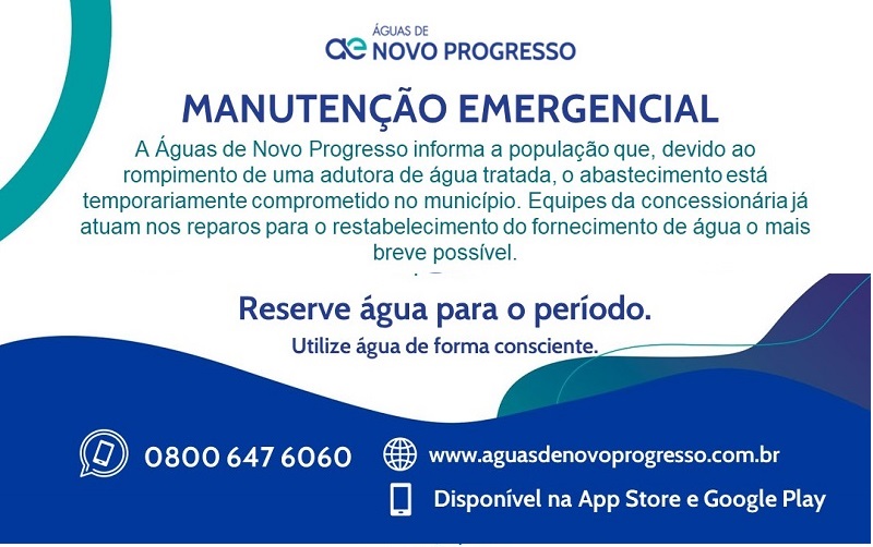 A Águas de Novo Progresso informa a população que, devido ao rompimento de uma adutora de água tratada, ocorrido na manhã desta quarta-feira (21.12), o abastecimento está temporariamente comprometido no município.