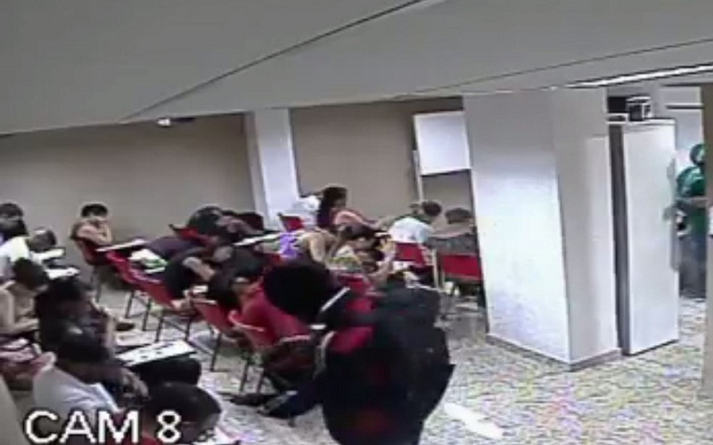 A câmera de segurança da sala de prova mostra a ação dos bandidos. Três suspeitos entraram durante a prova, encapuzados e armados, e recolheram carteiras, bolsas e celulares. Os ladrões colocaram tudo em mochilas e ameaçaram algumas pessoas.