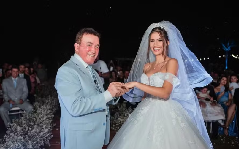 Cantor, de 74 anos, e Calita Franciele, de 23, se casaram com um festão em março