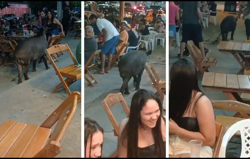 As imagens que viralizaram nas redes sociais, mostram pessoas tranquilamente aproveitando a noite, quando o animal se aproxima.