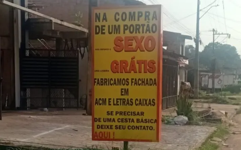 Uma postagem com a legenda “Marituba não e para os fracos e nem amadores 😂😂😂”, mostra uma placa em que são oferecidos serviços de venda de portões. No entanto, o que poderia ser um simples anúncio veio acompanhado da frase “Sexo grátis”. Num primeiro olhar, o entendimento é de que, ao comprar um portão no estabelecimento, o consumidor “ganharia” relações sexuais.