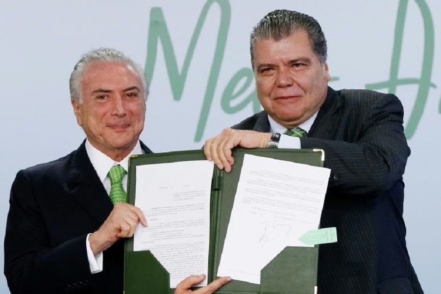 (Foto cedida pela Presidência mostra o presidente Michel Temer e o ministro do Meio Ambiente, José Sarney Filho, em Brasília, em 5 de junho de 2017)