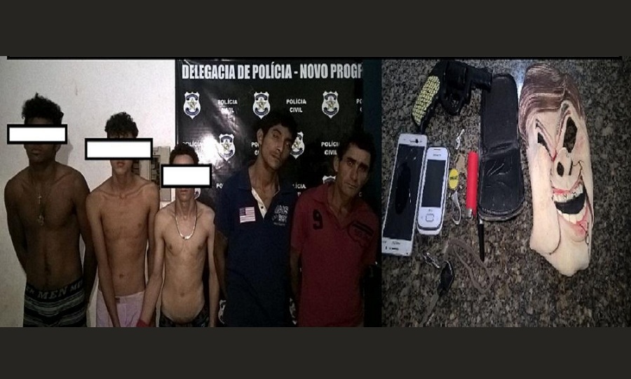 05 suspeitos de realizar ou planejar assaltos usando uma arma de brinquedo e máscara de monstro, foram presos em flagrante na noite desta quarta-feira (14) no Peixotinho 2 em Novo Progresso. De acordo com a polícia, a PM chegou até eles através de denúncia no serviço de disk-denúncia via celular da viatura, de que um homem estava armado em um dos estabelecimentos da rua.