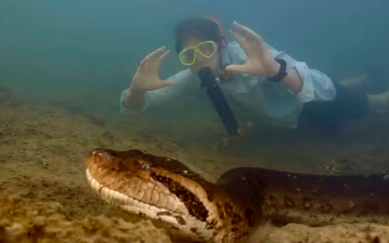 Vonk entrou num rio e nadou ao lado da gigantesca sucuri, de 8 metros de comprimento e mais de 200 quilos.