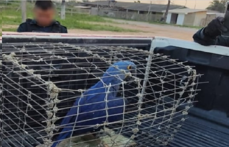 Arara-azul em gaiola é resgatada pela PM em Novo Progresso