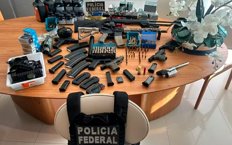 Fotos publicadas pela própria Polícia Federal mostram que foram encontrados um fuzil, pistolas e revólver, além de carregadores, muita munição e equipamentos táticos.