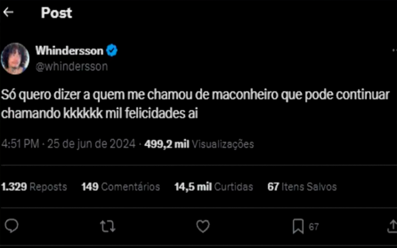 De maneira bem engraçada e irônica, o humorista Whindersson Nunes usou a conta no X, antigo Twitter, dizendo que as pessoas podem continuar o chamando de maconheiro.