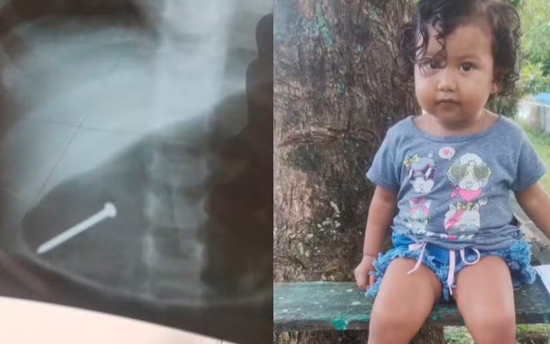 Menina brincava no chão da própria residência quando encontrou um prego e engoliu. Raio-x identificou objeto, que foi expelido pela criança após quatro dias.