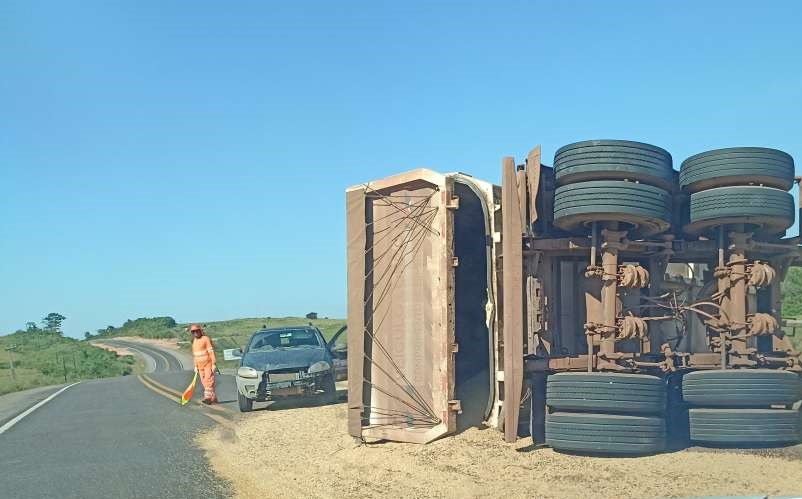 Bi trem de caminhão tomba após desviar de buraco na BR-163, em Novo Progresso