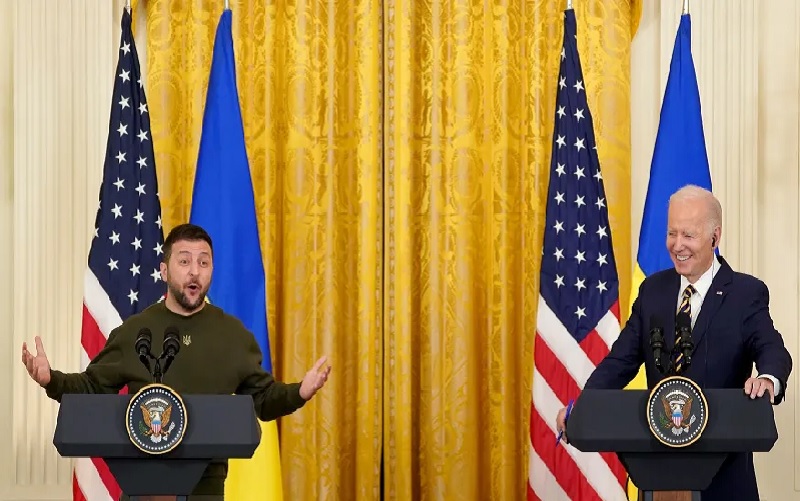Presidentes dos EUA, Joe Biden, e da Ucrânia, Volodymyr Zelenskiy, concedem entrevista coletiva na Casa Branca 21/12/2022 (Foto:REUTERS/Kevin Lamarqu).