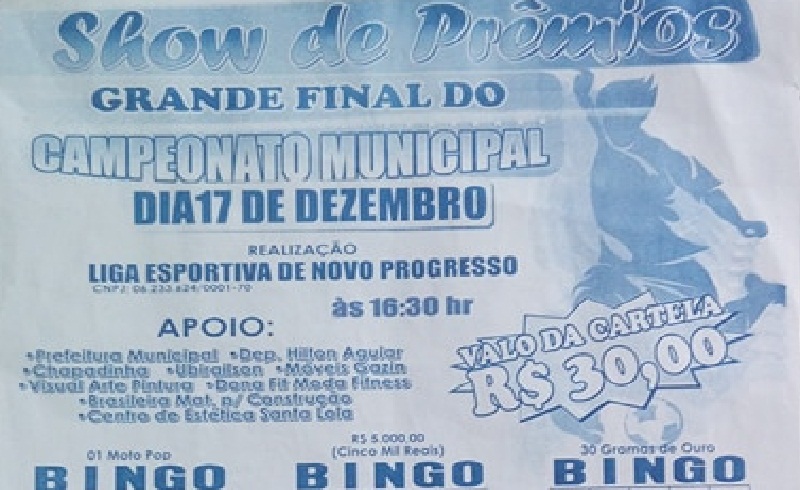 O BINGO DA LIGA ESPORTIVA DE NOVO PROGRESSO QUE FOI ADIADO DEVIDO MAL TEMPO, VAI ACONTECER NO PRÓXIMO SÁBADO DIA “23” NO GINÁSIO MUNICIPAL.