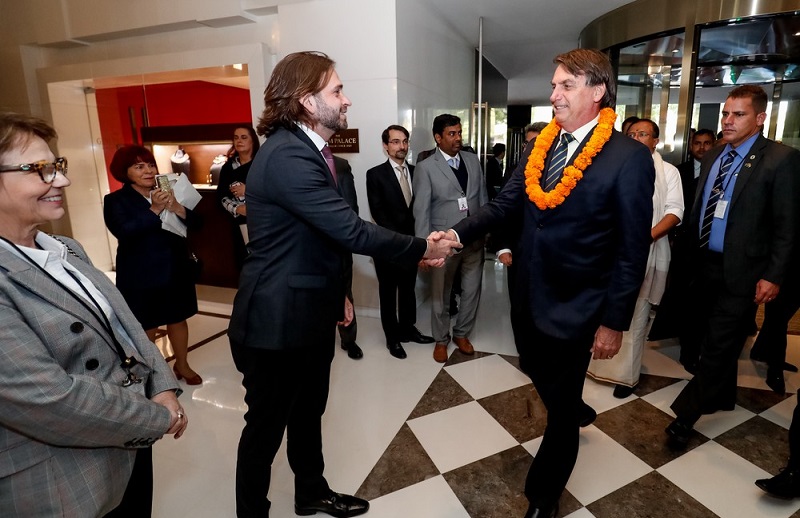 O presidente Jair Bolsonaro cumprimenta o ministro-chefe da Casa Civil em exercício, Vicente Santini, ao chegar em Nova Delhi na Índia — Foto: Divulgação/ Presidência da República/Alan Santos