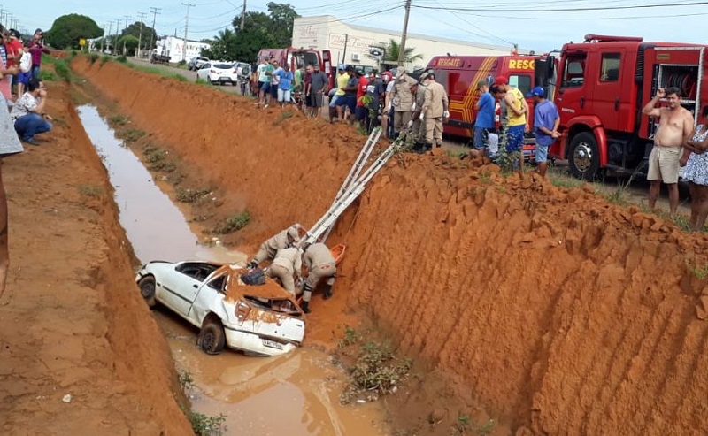 Bombeiros resgatam 5 que caíram com carro em vala de escoamento de água em Sinop