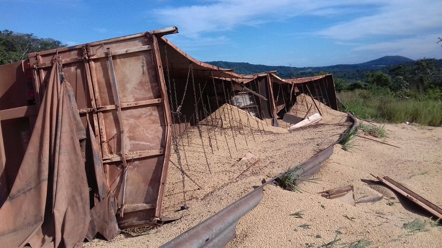 BR-163 – Caminhão carregado de soja tomba, motorista morre