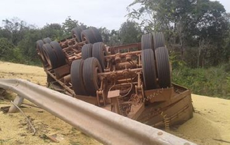 Segundo informações uma carreta bi trem carregada com soja trafegava pela rodovia quando o semi-reboque se desprendeu e tombou as margens da via. Não houve feridos, apenas danos materiais.