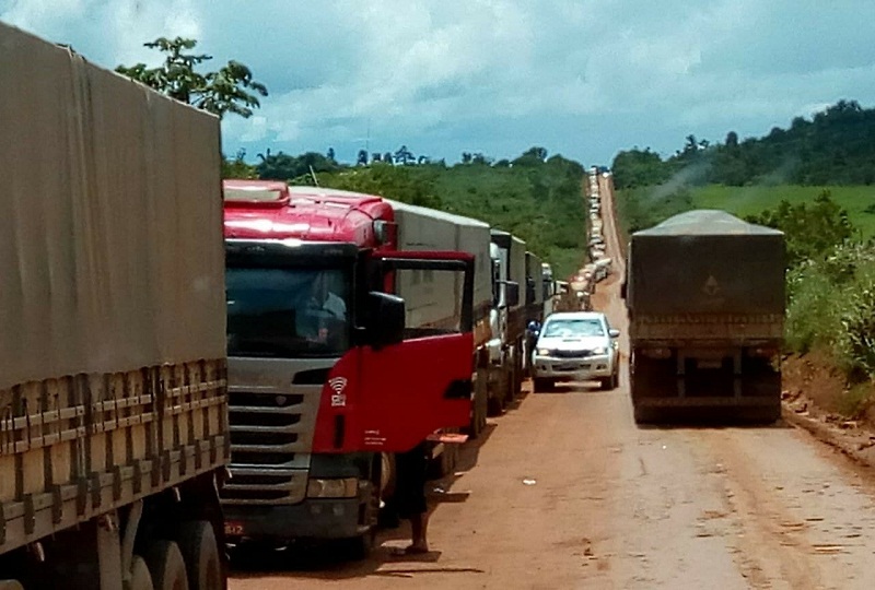 Os caminhões não estavam conseguindo trafegar em uma serra onde o exército executa obras com o DNIT, eles não sobem a serra, a lama impede para os que retornavam e os que seguiam até porto de Miritituba, no município de Itaituba (PA).