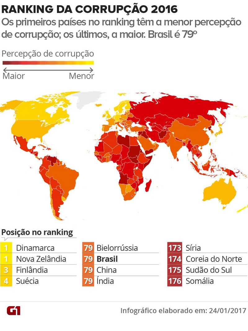 Estudo divulgado nesta quarta-feira (25) pela entidade Transparência Internacional aponta que o Brasil fechou o ano de 2016 em 79º lugar entre 176 países em ranking sobre a percepção de corrupção no mundo. Além do Brasil, estão empatados em 79º lugar Bielorrússia, China e Índia.