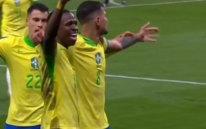 No segundo tempo, o Brasil seguiu com a melhor postura em campo. Aos 13′, Bruno Guimarães encobriu o goleiro após cruzamento de Vini Jr, mas Cáceres afastou o perigo em cima da linha.