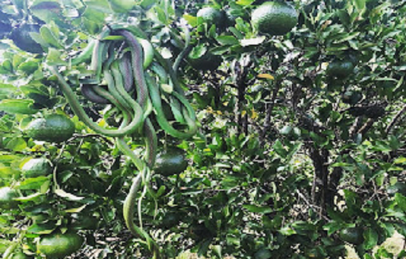 Em abril do ano passado, Telmo Santos registrou, no município de Santo Antônio da Patrulha (RS), um ‘cacho’ de cobras-verde penduradas sob os galhos de um pé de mexerica.