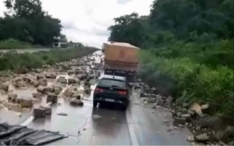 O derramamento de carga foi registrado, há pouco, no trecho da BR-364, na Serra de São Vicente, em Santo Antônio do Leverger.