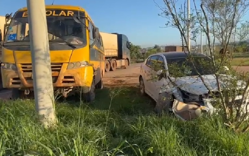 Câmera flagra colisão entre ônibus escolar e carro em Novo Progresso