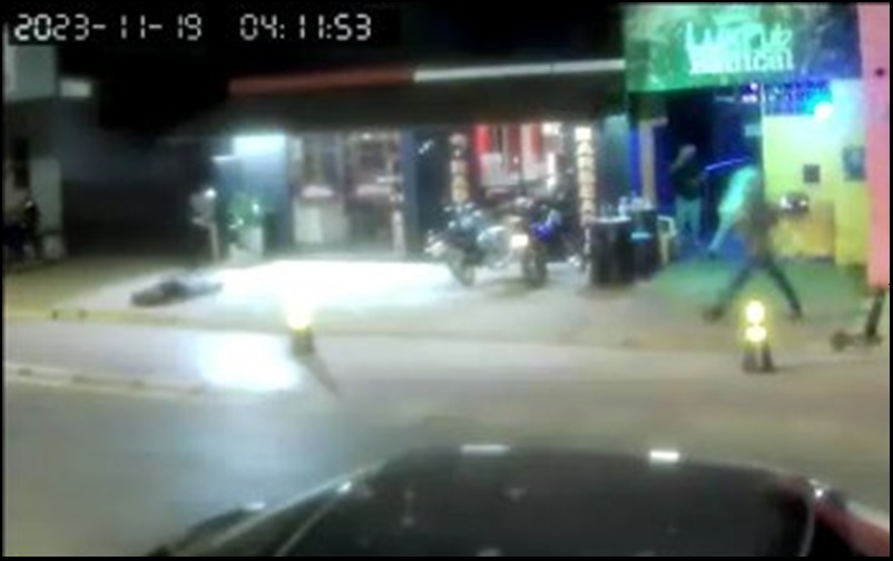 Nas imagens, é possível ver o veículo se aproximando do local do crime, em um bar da cidade. Em seguida, ouve-se diversos disparos, momento em que algumas pessoas correm para dentro do estabelecimento para se esconder.