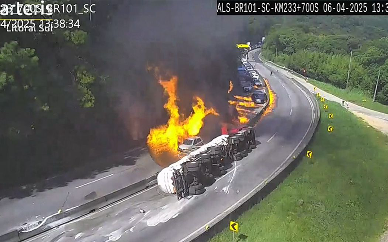 O tombamento ocorreu no sentido Norte da pista, na região conhecida como Morro dos Cavalos. Nas imagens, é possível ver o acidente no canto inferior do vídeo, quando o caminhão carregado de etanol vira na curva e as chamas têm início.