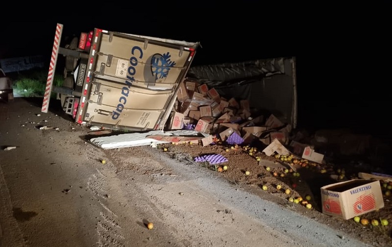 Caminhão carregado de maçãs tomba na BR 163 em Novo Progresso