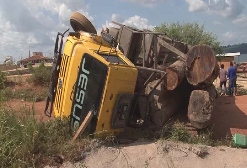 Um caminhão carregado de toras de madeira ilegal tombou na tarde desta terça-feira (10) em Altamira, no sudoeste do Pará.