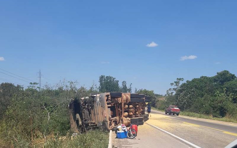 Caminhão carregado de milho tomba na BR 163 próximo a Novo Progresso