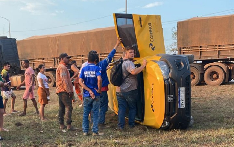 Caminhão colide na traseira de veículo do correio que é jogado para fora da pista e capota na BR-163 em Novo Progresso