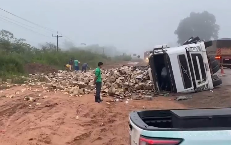 Caminhão com carga de cachaça tomba na BR-163 perímetro urbano de Novo Progresso