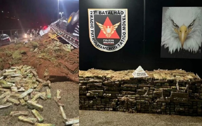 O caminhão, que transportava uma tonelada de maconha, acabou tombando na avenida Juscelino Kubitschek, bem em frente ao Batalhão da Polícia Militar.