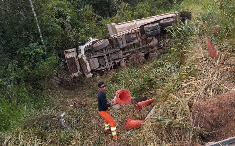Caminhão Da Concessionária Via Brasil tomba e motorista sai ileso
