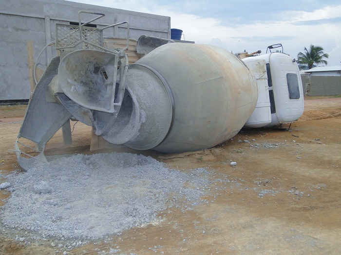 Um caminhão MB placa ADZ-6561 de Novo Progresso, com massa de cimento da empresa Torre Forte Concreto Usinado, tombou nesta última quinta-feira (06/11), no bairro jardim América em Novo Progresso.