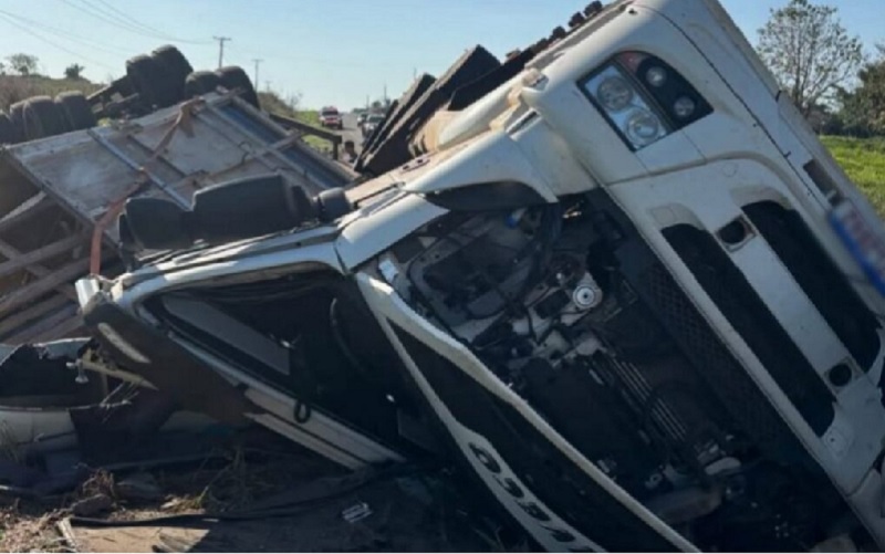 De acordo com informações apuradas, o motorista perdeu o controle do veículo ao atingir um buraco na pista. O caminhão acabou tombando às margens da rodovia, provocando apenas danos materiais. A carga ficou espalhada pelo chão.
